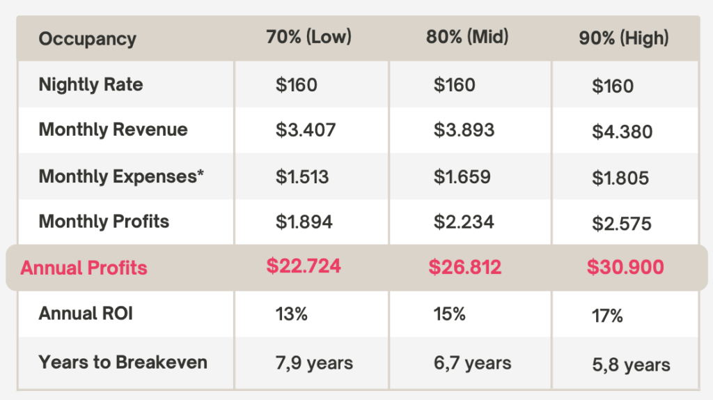 Above average returns with low construction and operational costs. Airbnb-Arbitrage investment profits averaging at 25% Annually